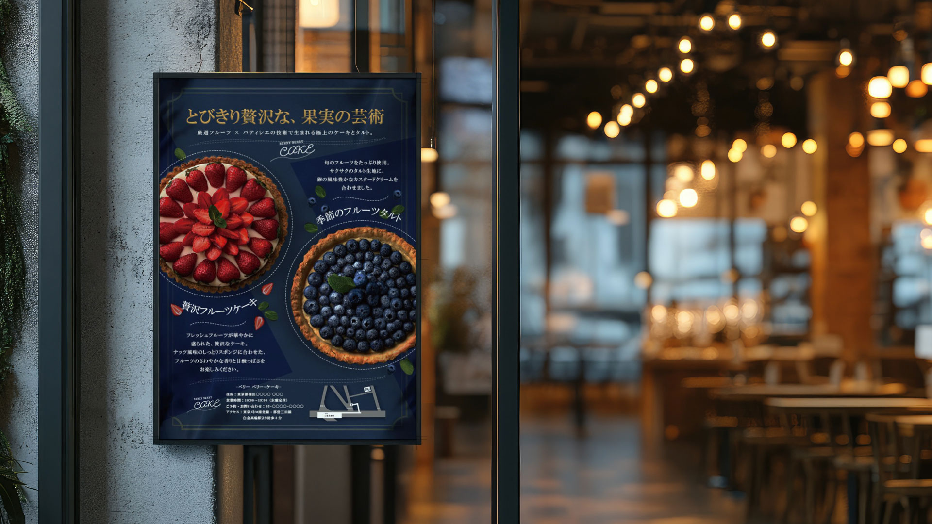 プロンプト:『ケーキ屋さんのチラシを作りたいです。掲載内容案を考えてください。高級感のあるフルーツケーキ・タルトのお店です。』