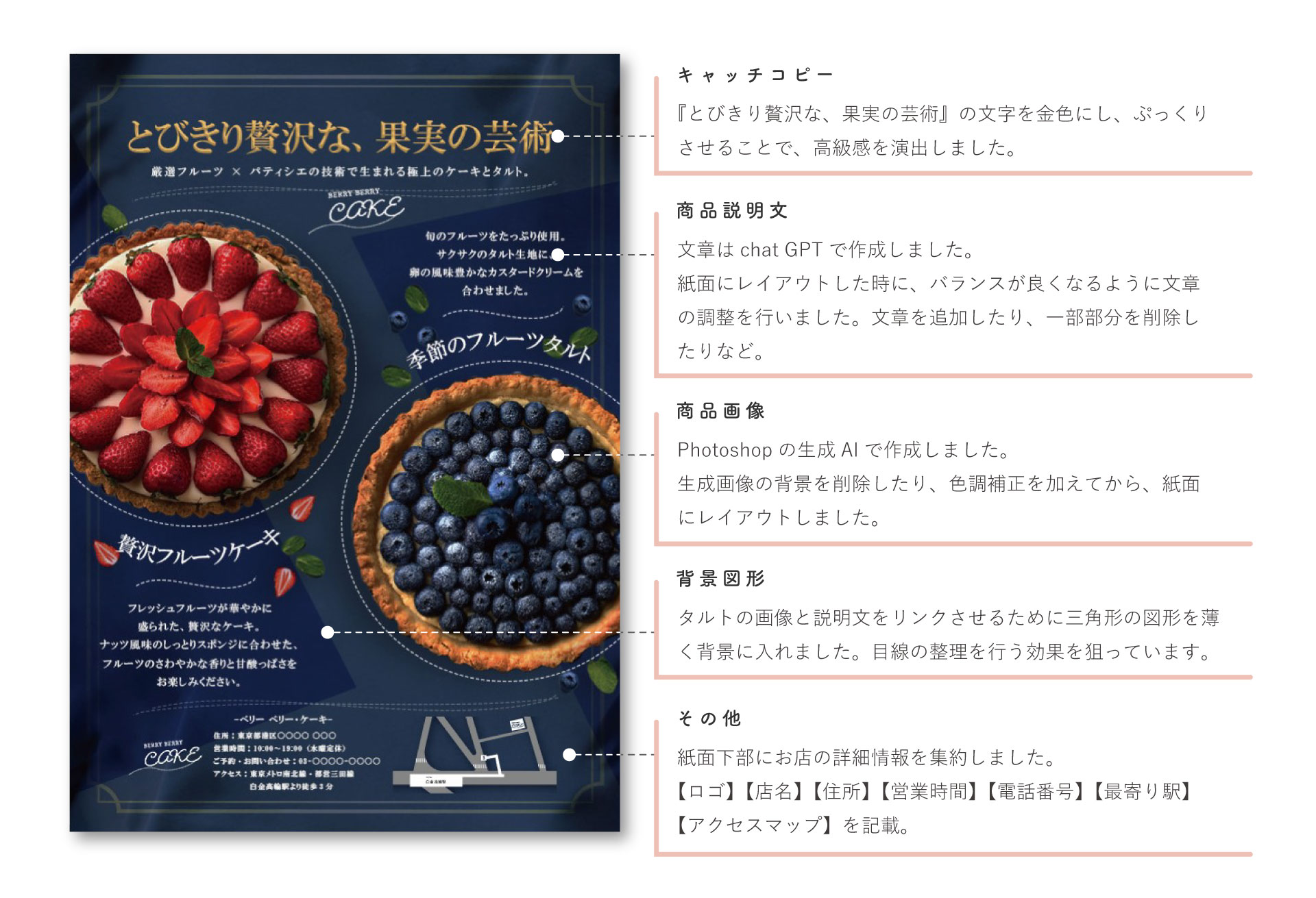 プロンプト:『掲載内容案をレイアウトし、画像にしてください。』+ ①で作成したタルトの画像を参考画像として、アップロードしました
